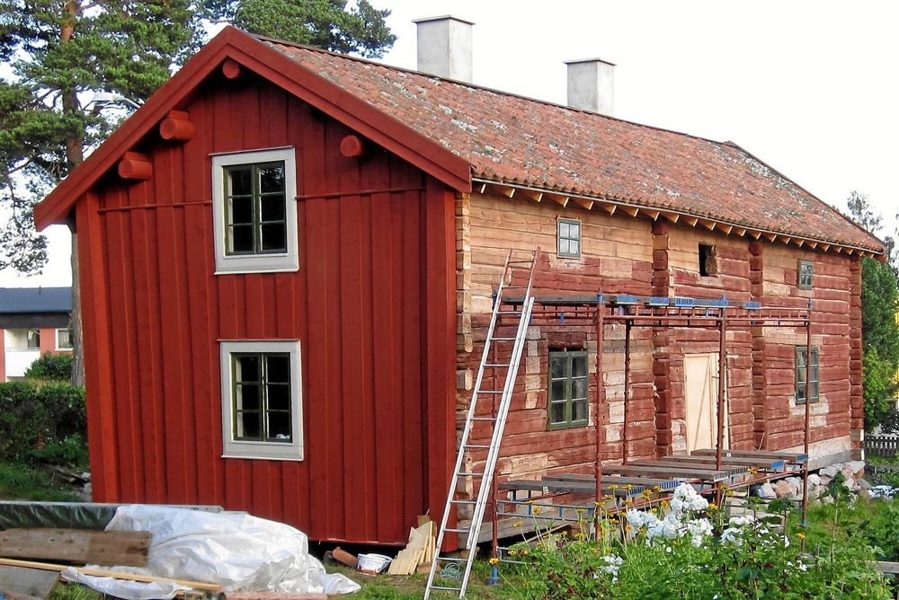 Samma gavel sommaren 2008. Den nya kilsågade lockpanelen börjar komma på plats efter omfattande timmerlagning. Fasaden är målad med ljus faluröd, fönsterbågar med Ottossons Köpenhamnsgröna linoljefärg. Fodren målade med titanvitt brutet med grön umbra. Båda fönstren på gaveln är nyupptagna. Skulle de nya skorstenarna bli bra? Dessa vållade mycket diskussion om gällande regelverk, men paret blev mycket nöjda med dessa putsade blockskorstenar.