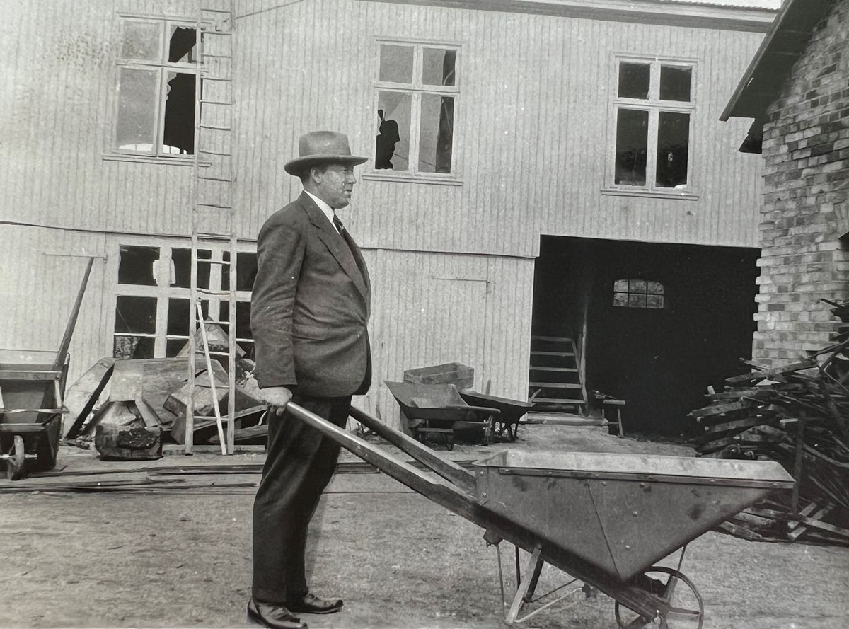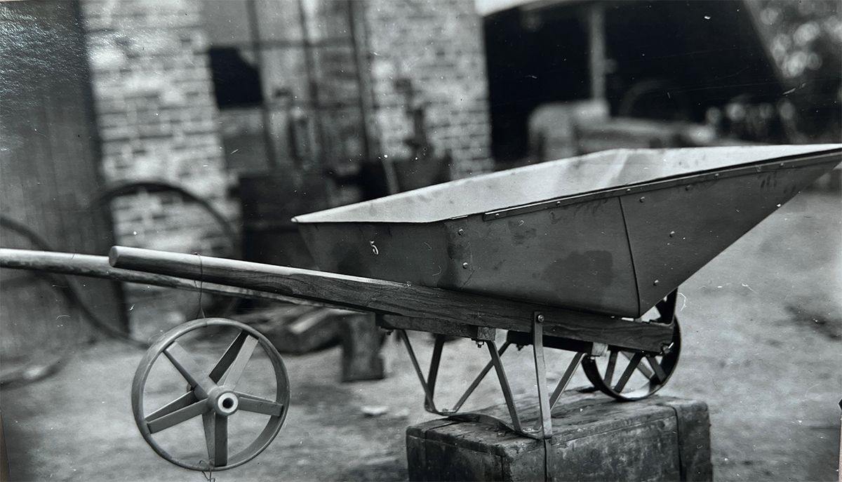 Skorna är blanka och dagen till ära har smeden Nils Birger Eriksson både finkostym och hatt. Året är 1926 och han låter fotografen porträttera den nya skottkärran, Ekebykärran. Tidigare gjordes skottkärrekorgar i trä. Nils Birger Eriksson gjorde i stället korgen i plåt.