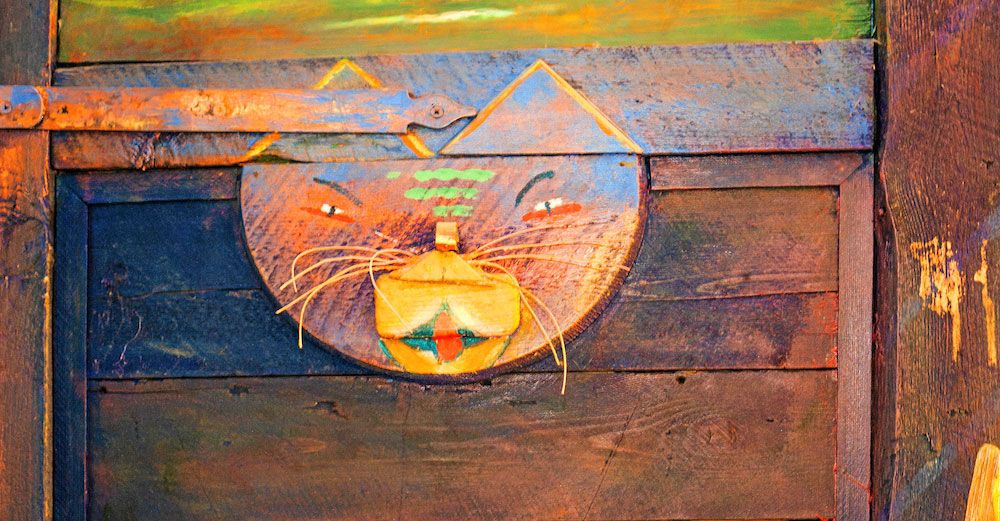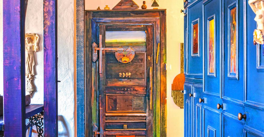 Här bor konstnärsparet Katarina och Ronny Hård, som välkomnar oss in i sitt färgsprakande hem. Redan i farstun stannar vi förbluffat till vid de utsmyckade, färggranna dörrarna. Är vi på väg in i ett sagoslott?
