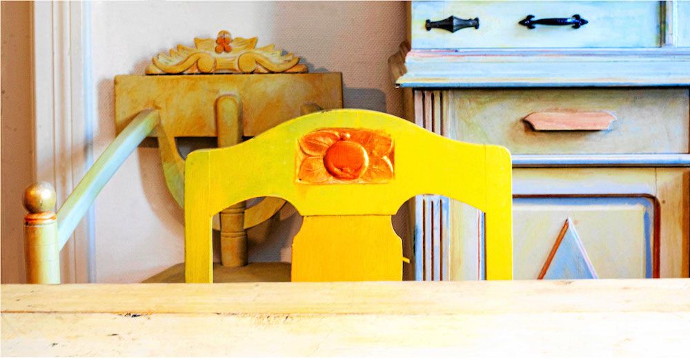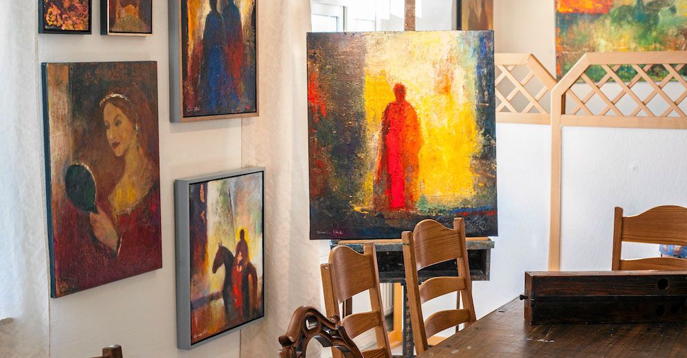 Nu målar hon färgstarka tavlor och skapar konst med grafiskt tryck. Tavlornas motiv trollbinder och för tankarna till sagans värd.