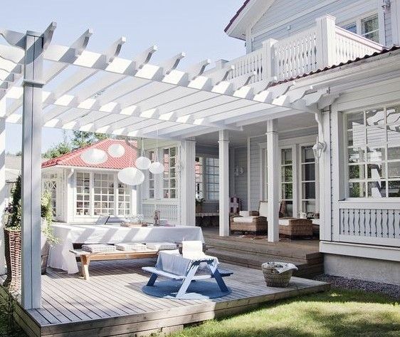 Luftig pergola med plats för mycket häng i taket. Perfekt för lyktor, lampor och hängfåtöljer. Här leder pergolan in till husets veranda som får extra skydd och en mysigt inbyggd känsla. Källa