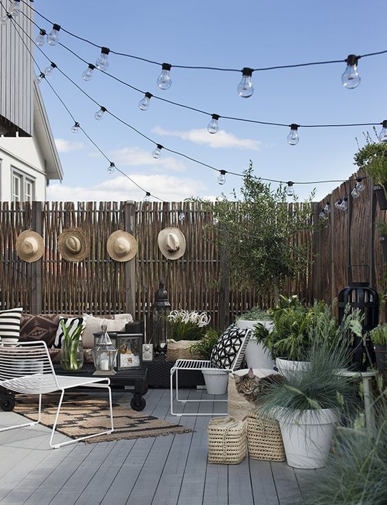 Flätat staket av salix ger en lantligt charmig inramning. Mysig belysning med slingor med glödlampor av glas. Finns bland annat hos Markslöjd. Källa