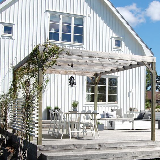 En pergola ger fin rumskänsla åt en del av altanen. Bygger du den ytterst på trädäcket så stjäl den minimalt med ljus från husets fönster. Källa
