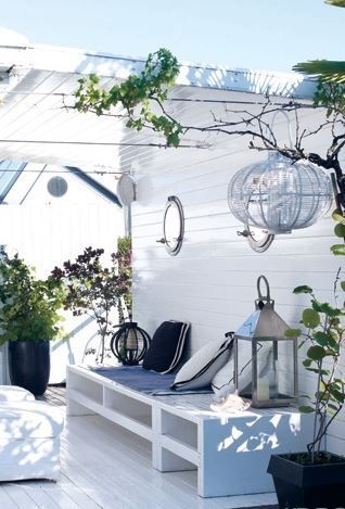 Bänkar som också fungerar som förvaring för dynor bildar en mysig hörna mot räcket. Ger fina sittplatser, avställningsytor och plats för krukor och prydnadsföremål. Uteöbler med inbygd förvaring hittar du bland annat här. Källa