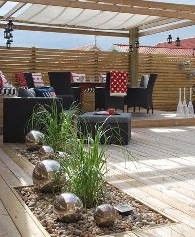Skippa krukorna och plantera direkt på golvet. Nedsänkta planteringar med sten och gröna växter ger altanen en snygg japansk look. Källa