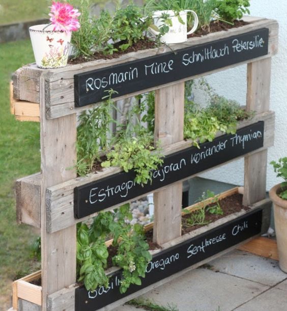 Kul idé med lastpall som avskärmning och plats för sommarens kryddolingar. Källa