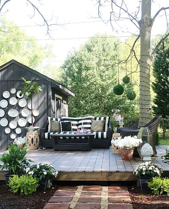 Ett trädäck i anslutning till gäststugan ger en fin läplats. Här har väggen dekorerats med porslinsfynd från loppis. Trädet till höger är inbyggt i däcket. En ljusslinga är virad om stammen och grenarna används som naturlig upphängning till lyktor och dekorationer. Källa