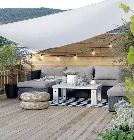 Spänn segelduk över altanen så får du skön skugga samtidigt som det skyddar mot vind och regn. Källa