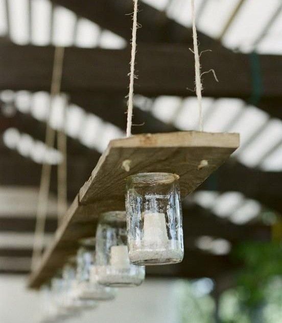 Fint hängande lykta gjord av en bräda, barnmatsburkar och rep. Källa