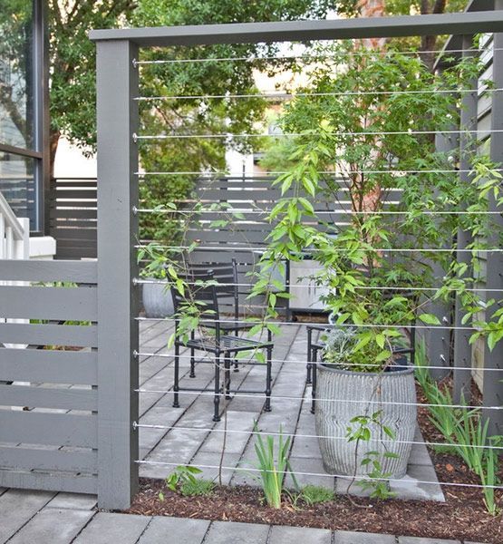 Vajrar mellan staketstommar ger fint stöd till växande plantor samtidigt som det ger uteplatsen insynsskydd och avskärmning. Källa