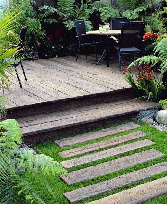 Här är det åldrat trä som ger karaktär åt altanan. Kul och snyggt med plankor direkt på gräsmattan. Källa