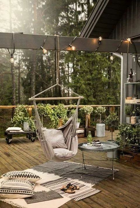 Lyxigt bekvämt med en hängande fåtölj. Men den kräver en stadig anordning för upphängning. Här en kraftig bjälke som samtidigt utgör en fin ljuskälla. Källa