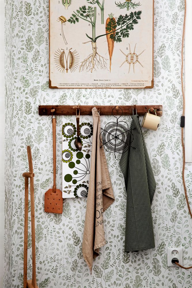 Inne i huset är det varmt och skönt med mycket grönska. Många krukväxter är placerade på fönsterbrädorna och gamla skolplanscher, tavlor och tapeter som förstärker det gröna intrycket.