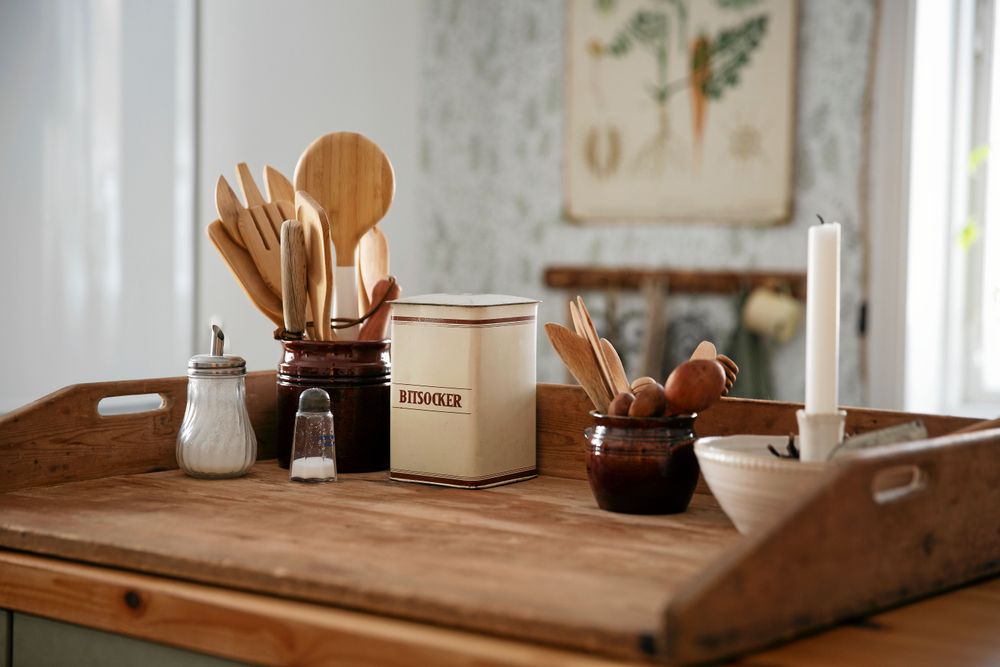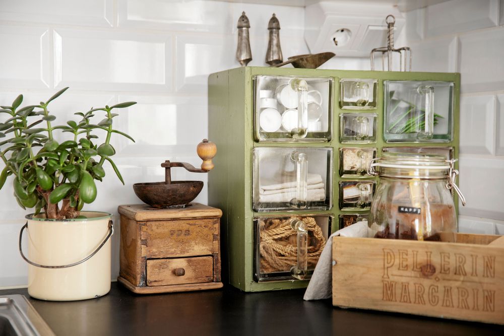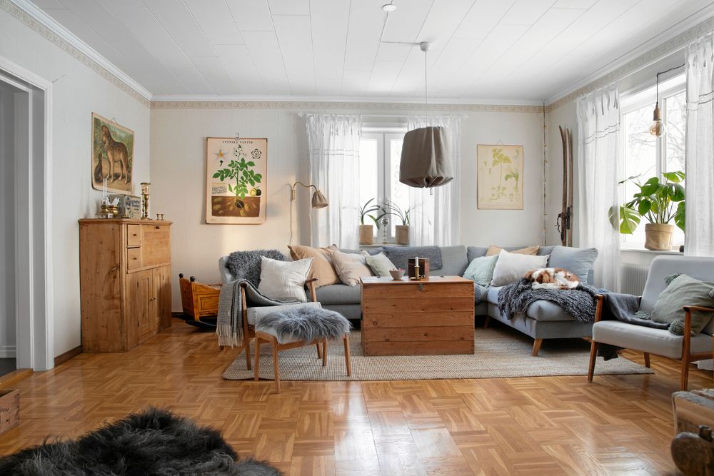 Möblerna är arvegods och återbruk, som soffbordet som är en gammal vedlår, antika skåp, kommoder, stolar med mera.