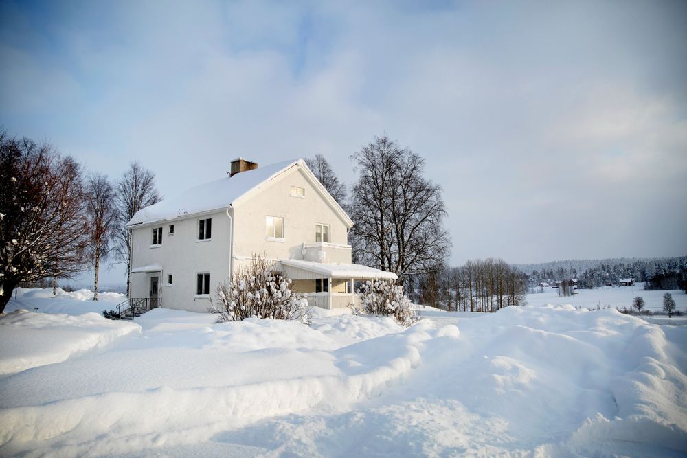 På tomten är snön meterhög och en smal gångväg leder fram till huset.