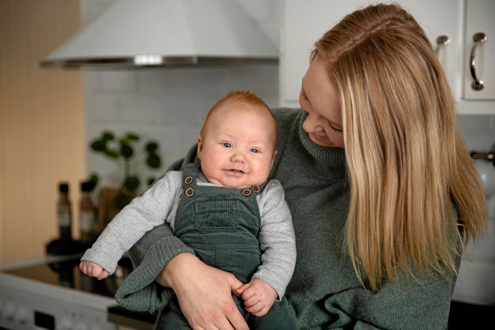 Felicia bär honom på höften när hon visar oss runt i husets stora rum, minst 30 kvadratmeter vardera.