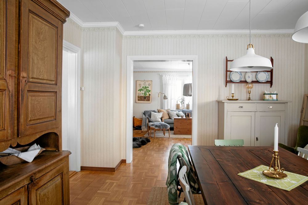 På bottenvåningen är det öppet mellan salen och matsalen med fiffiga skjutdörrar.