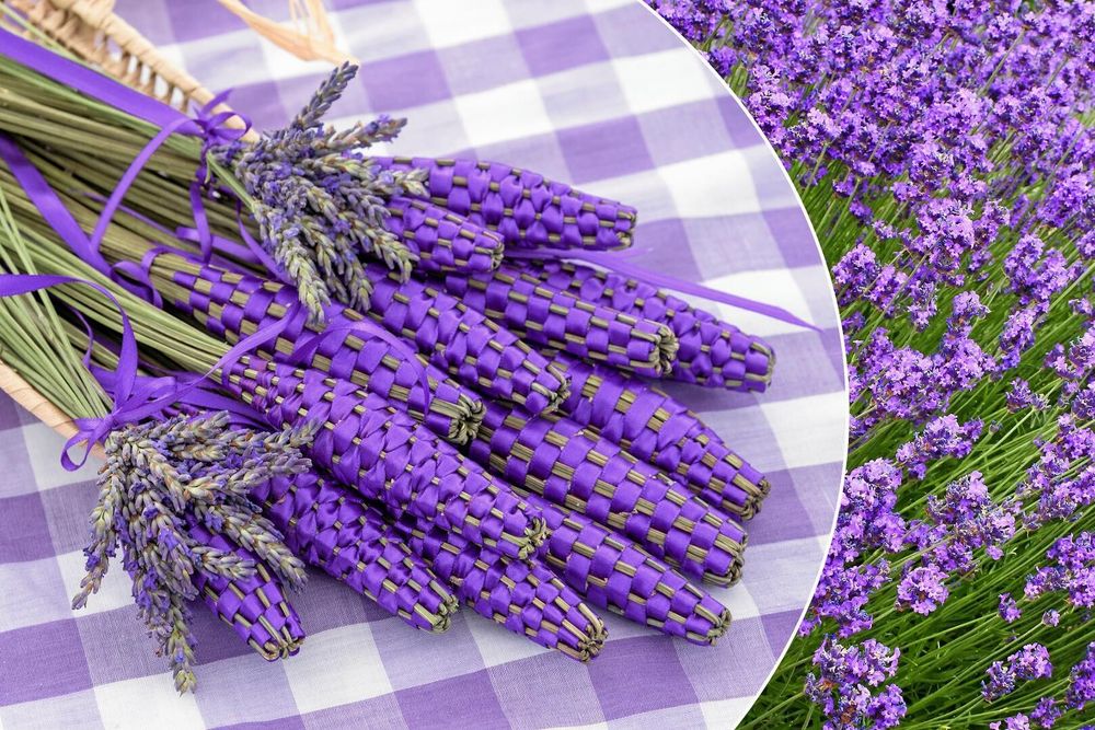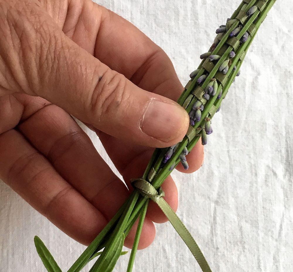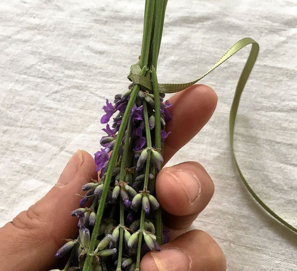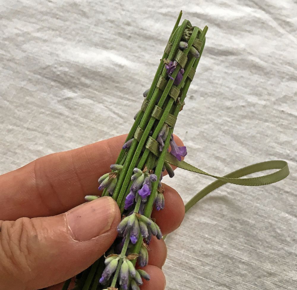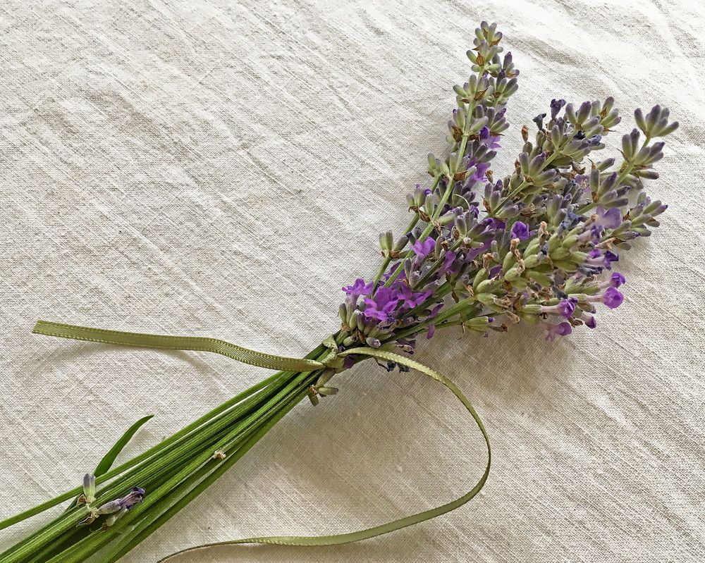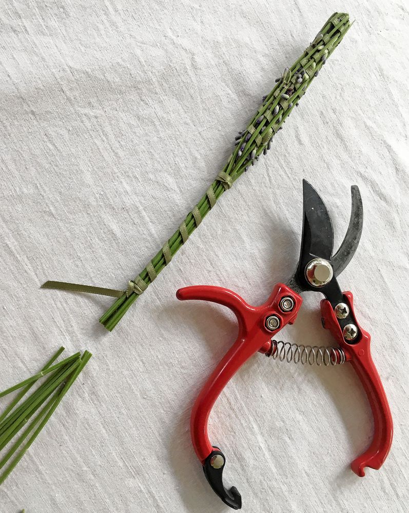 1. Klipp av ett ojämnt antal långa stjälkar lavendelblom. Nio eller elva stycken brukar fungera. Pröva dig fram, bästa antalet hänger på hur knubbig buketten är. Rensa bort blad från blomstjälkarna.