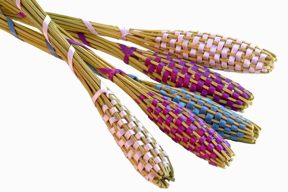 4. När alla stjälkarna vikts ner fortsätter man med bandet runt. Eftersom du har ett udda antal stjälkar får en stjälk som har bandet under sig på varv ett, bandet under sig på nästa varv.