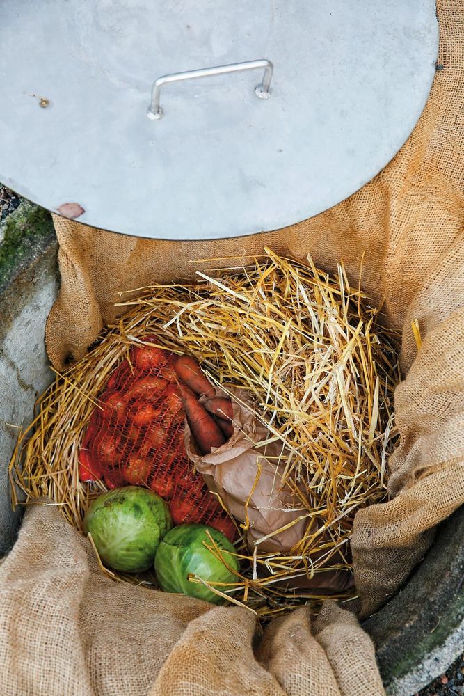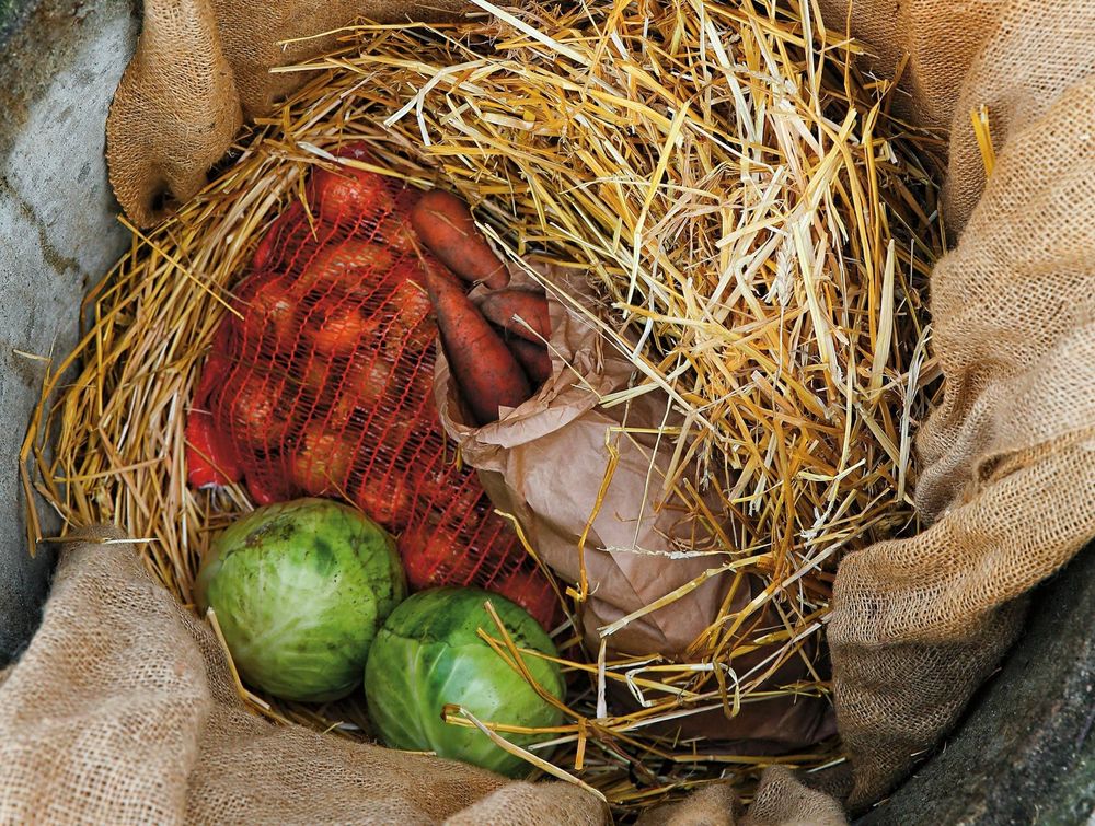 När allt är på plats är det bara att fylla upp förvaringsröret med trädgårdens godsaker. Försök att skilja på frukt och grönsaker för att äppelskördens etylengas inte ska förstöra resten av skörden. Förvara lök, morötter, potatis, palsternacka och trädgårdens alla rotfrukter i röret. Även squash mår bra i cementröret, liksom kål som trivs med en lagringstemperatur runt nollstrecket, gärna med en luftfuktighet på 90-95 procent. Lägg kålen i en kartong av papper eller rakt i en nätsäck och sänk ner i cement röret. Efter hand som du plockar upp frukt och grönt fyller du på med halm för att stänga ute kylan.