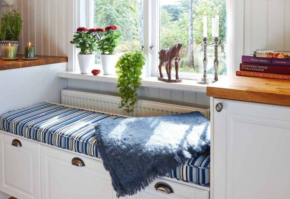 2. Bänken består av en överskåpsstomme med utdragbara lådor. Dynan fick vi måttbeställa i en inredningsbutik.