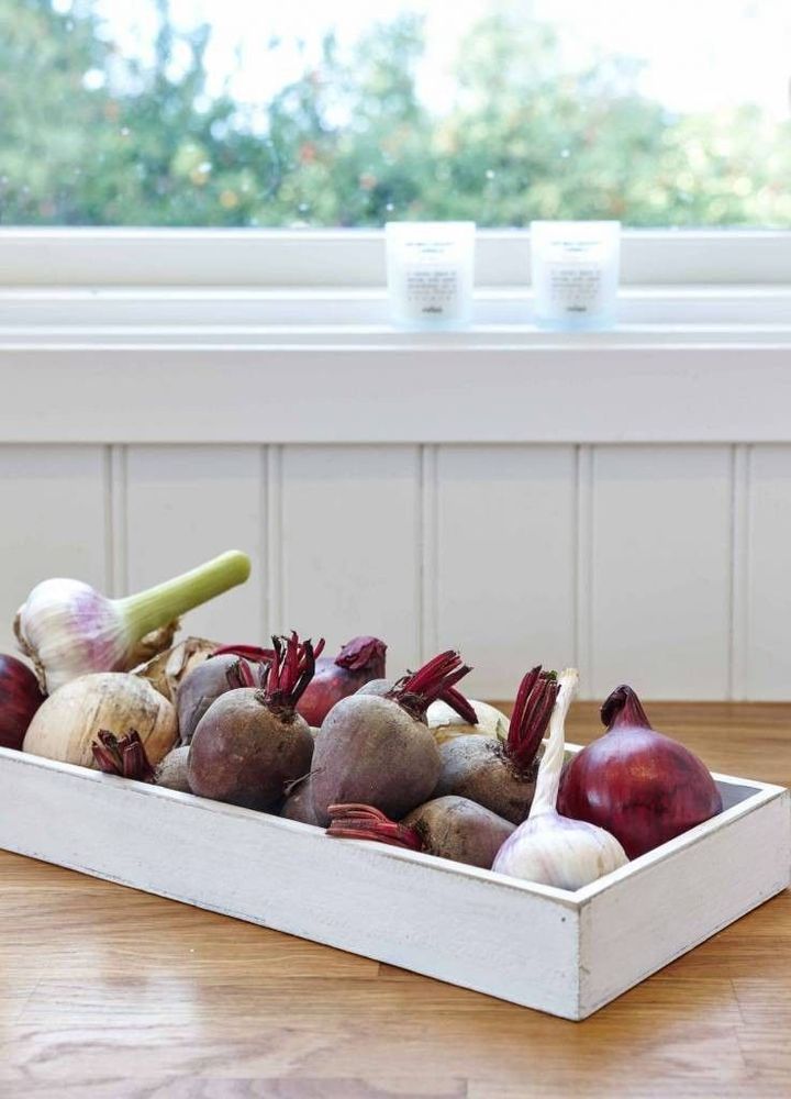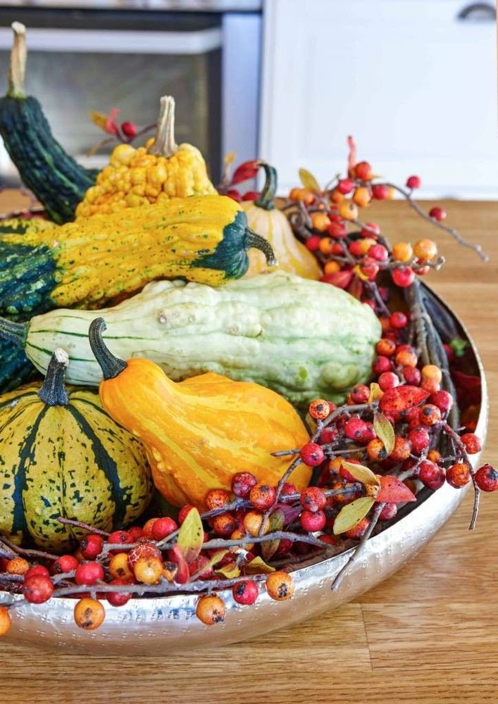 10. Färgstarkt med prydnadspumpor på en silverfärgad bricka från Mio.