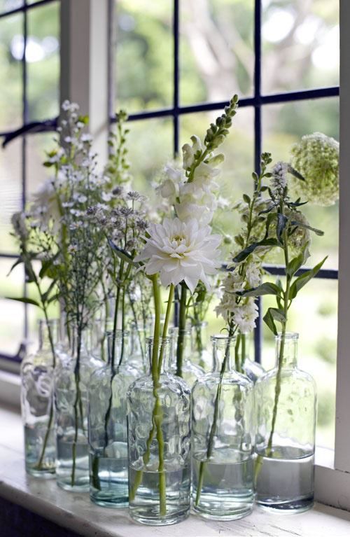 Några flaskor på rad i fönstret. Visst kan det räcka för att få in våren i rummet. Källa