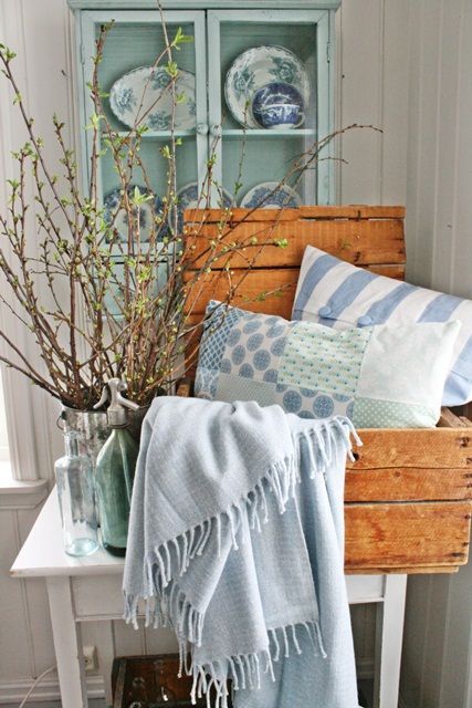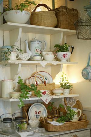 Du som har öppna hyllor med porslin i köket kan prova att sätta gröna växter i några av kopparna och skålarna. Ger ett fräsch och livfullt intryck. Källa