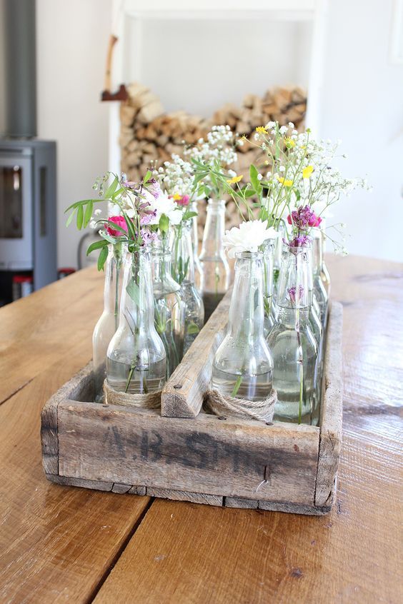 Bloggaren Lina by the bay har gjort det här fina arrangemanget med söta blommor i små flaskor samlade i en trälåda. Enkelt, vackert, somrigt.