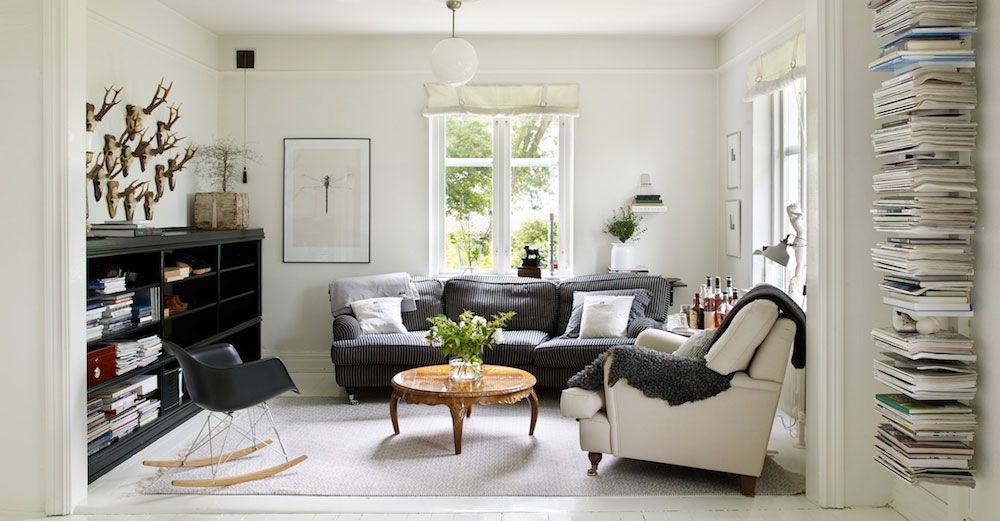 I dag andas huset harmoni och är varsamt renoverat och anpassat efter familjen behov. Rummen är inredda med en ljus bas, där ärvda och loppisfyndade möbler samsas med moderna designmöbler. Plus egensnickrade alster, som bokhyllor, bord och en köksö som Jeppe har designat och byggt. Stilen i huset är lantlig, och inrett i en avskalad stil med nordisk känsla