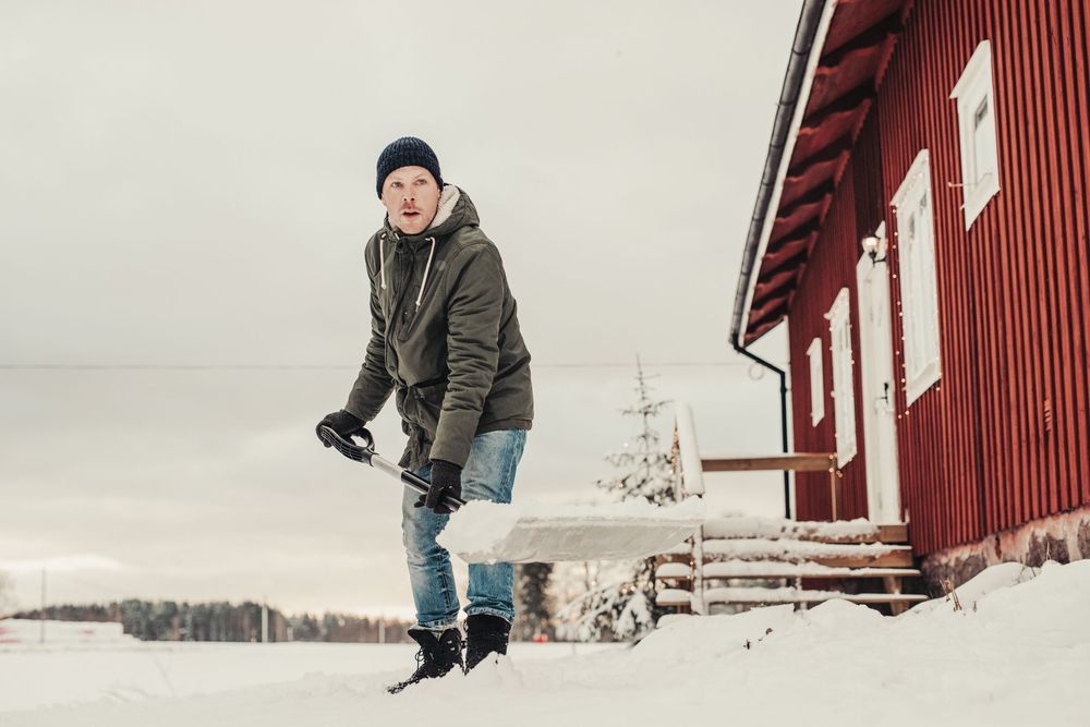 Man skottar snö med skyffel utanför rött trähus.