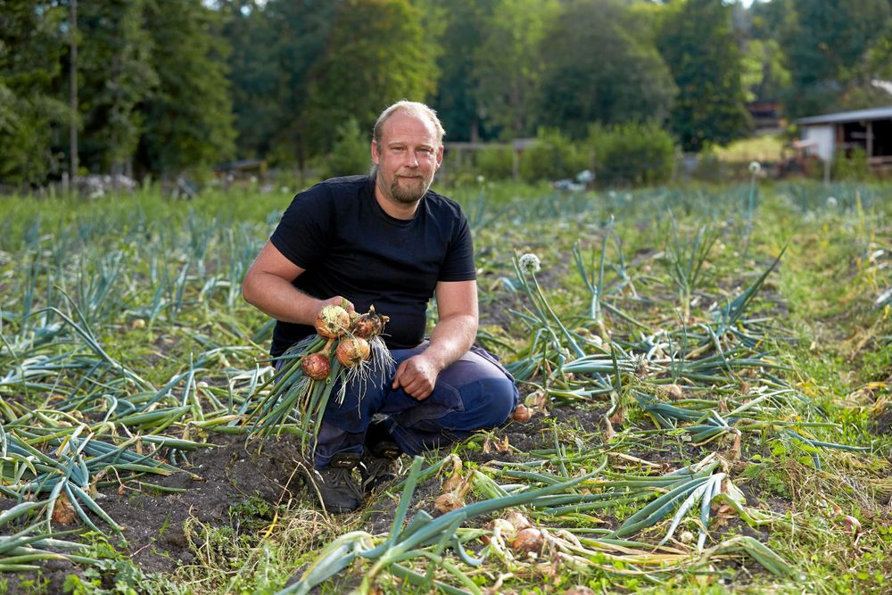 – Jag har inte sått så mycket i år. Men jag räknar med att det blir ett par ton lök, två till tre ton morötter, allt Krav-odlat.
