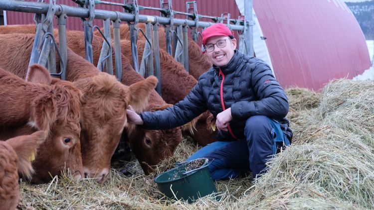 Aron Saldner driver nötköttsproduktion på Katebo gård i Östergötland tillsammans med sambon Paulina Johansson. De satsar på att föda upp fler kalvar på gården och därmed köpa färre djur från andra besättningar.