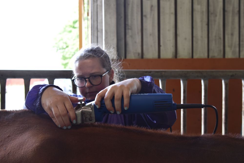 Linnea Knutsson är en av ledarna på lägret och visar hur man går tillväga för att klippa och styla kalvarna på bästa sätt.