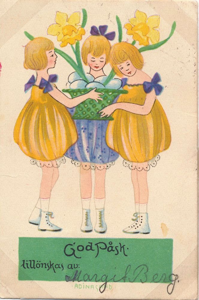 Påskflickor i blomsterliknande dräkter på kortet tecknat av Adina Sand ger fin vårkänsla.Foto: Postmuseums arkiv