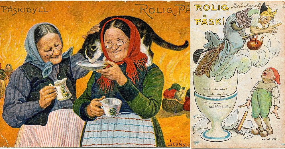 Skärtorsdagen är den traditionella dagen för resor till Blåkulla, som för de här glada påskkärringarna målade av Jenny Nyström.Foto: Postmuseums arkiv