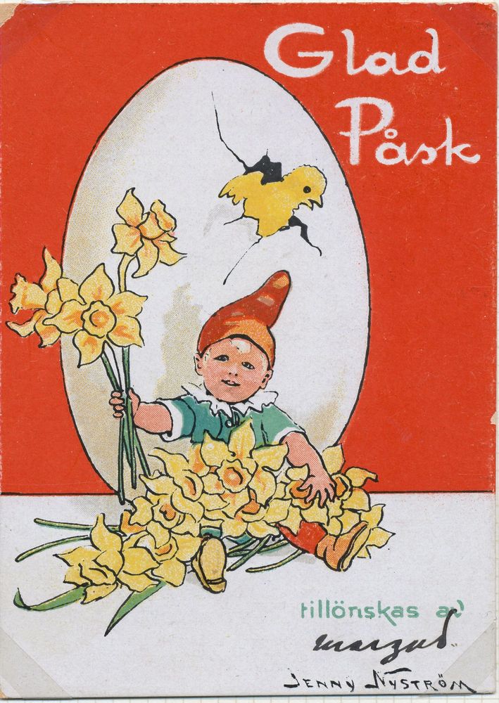 Jenny Nyström, känd för sina söta julkort, står bakom en mängd populära påskkort. Det gör även Einar Nerman, Adina Sand och Signe Aspelin.
