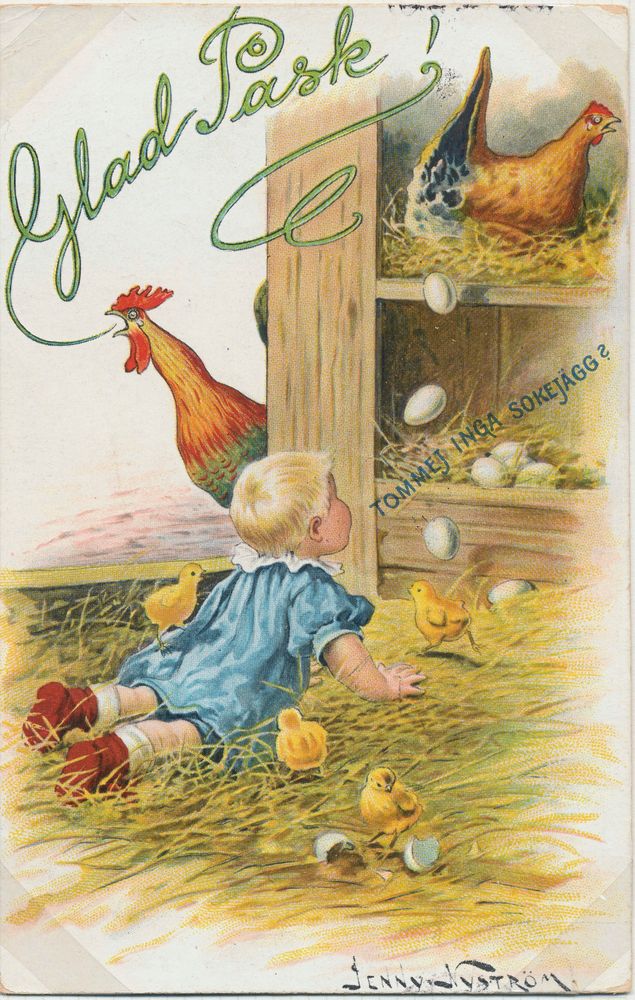 ”Tomme inga sokejägg?” Kkommer inga sockerägg?, frågar det lilla barnet på Jenny Nyströms påskkort.Foto: Postmuseums arkiv