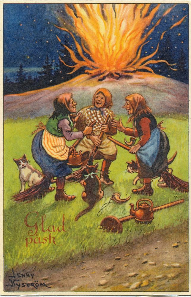 Så här mysigt har påskkärringar när de väl kommer fram till Blåkulla. Påskkortet är gjort av Jenny Nyström 1913.Foto: Postmuseums arkiv