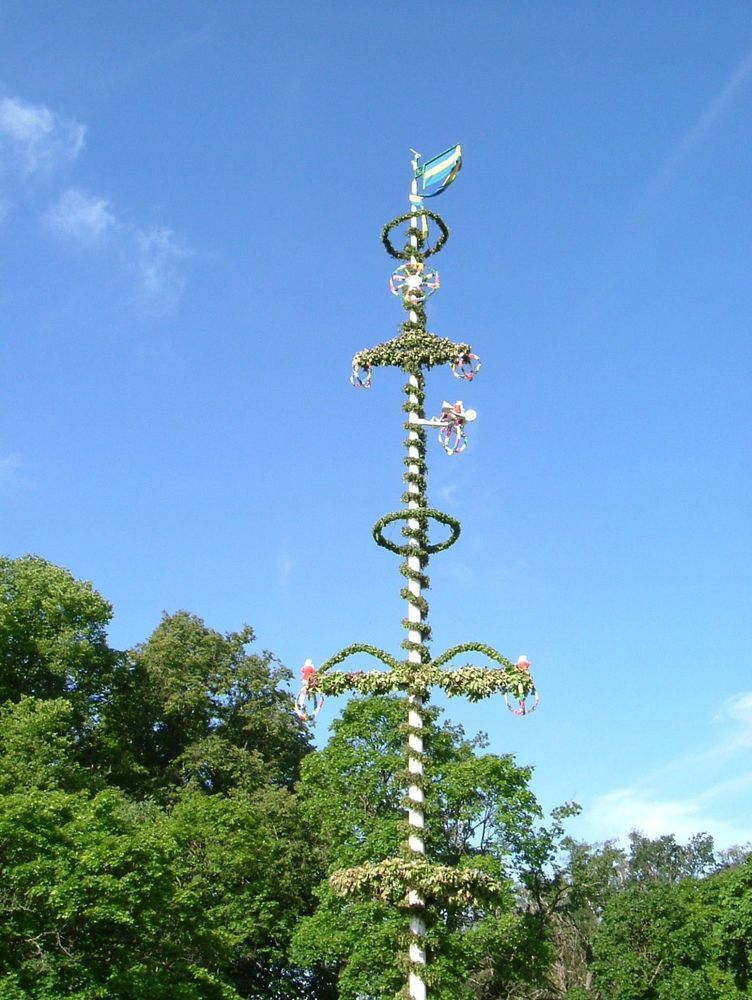 Ortsborna klär stången dagen före och reser den med störar på midsommarafton.