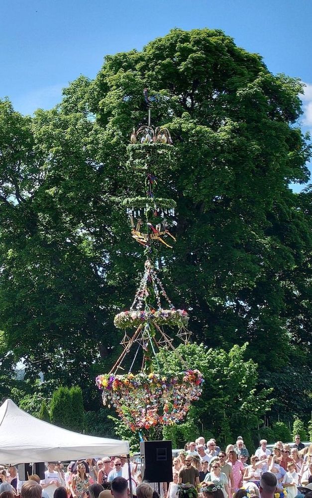 20 kransar och en tupp i toppen har den ståtliga midsommarstången i Herrljunga hembygdsförening, i kommunen med samma namn i Västergötland.