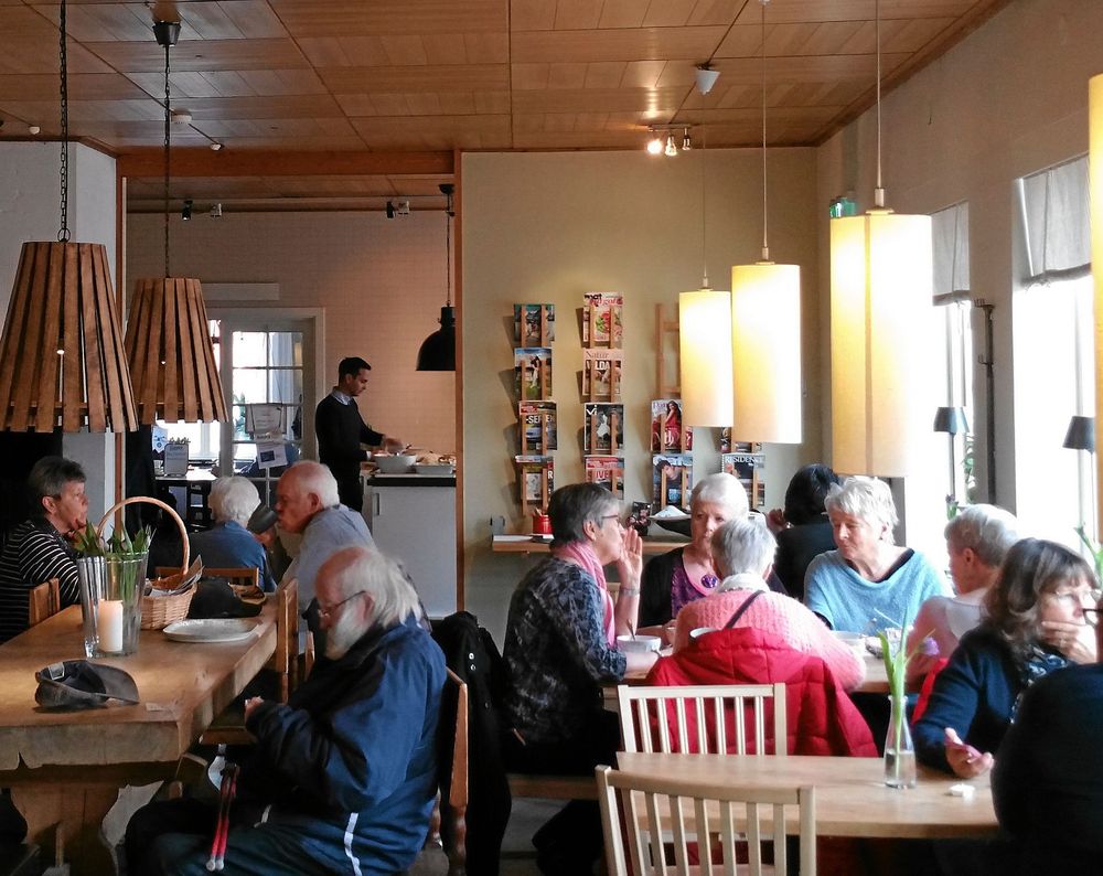 Att bli sittande på kondis, som här på Siljans konditori i Leksand, är en behaglig del av livet. Pratande eller bara drömmande. På bortre väggen finns tidningsställ.