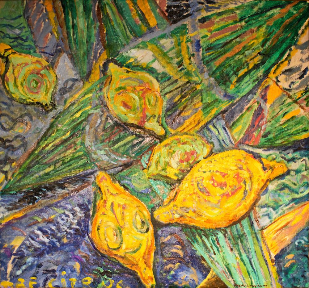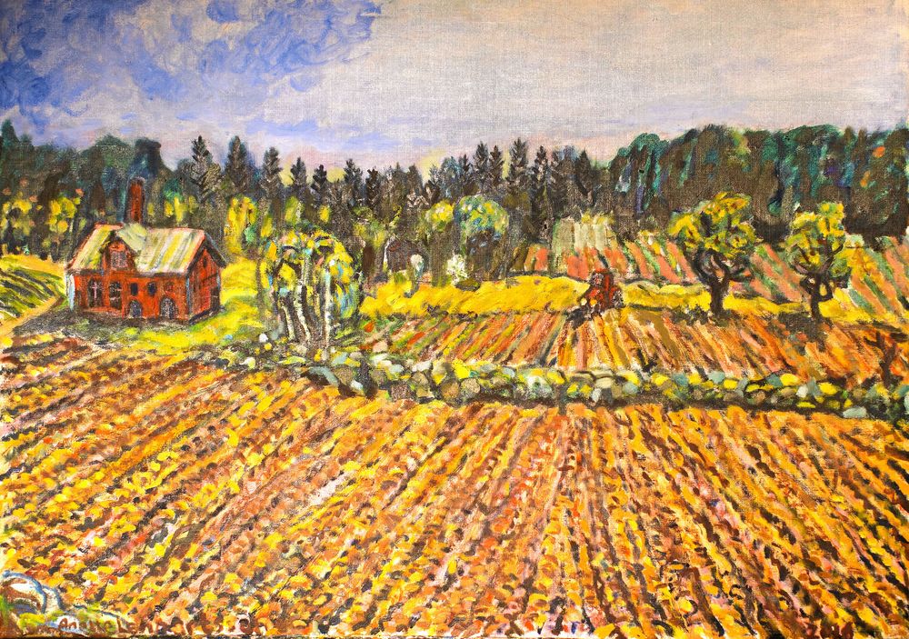 I lantköken på hennes målningar snor sig trasmattorna som färgglada slingerormar längs golv, väggar, skänkar och pinnstolar. Potatisåkerns bruna fåror inramar det gamla bränneriet som omvandlats till kulturhus.