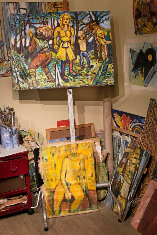 Staffliet står i ett hörn av sovrummet, färg, penslar, färdiga och påbörjade tavlor, skisser, böcker och färgglada tyger på hyllor, bänkar och i varje vrå.