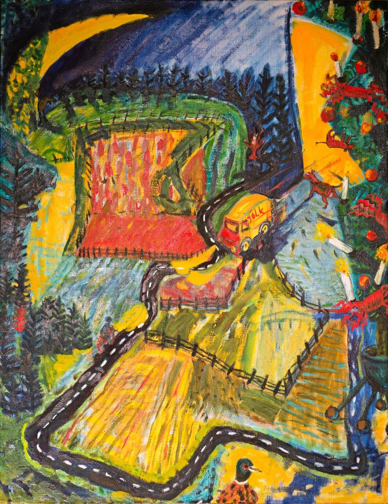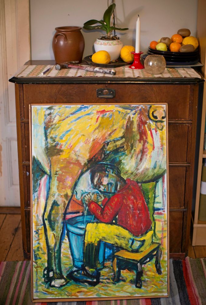 Tavlan ”Mjölkbilen kommer” är en skildring av den moderna bondevardagen och livet på landet med ökad stress och teknik.