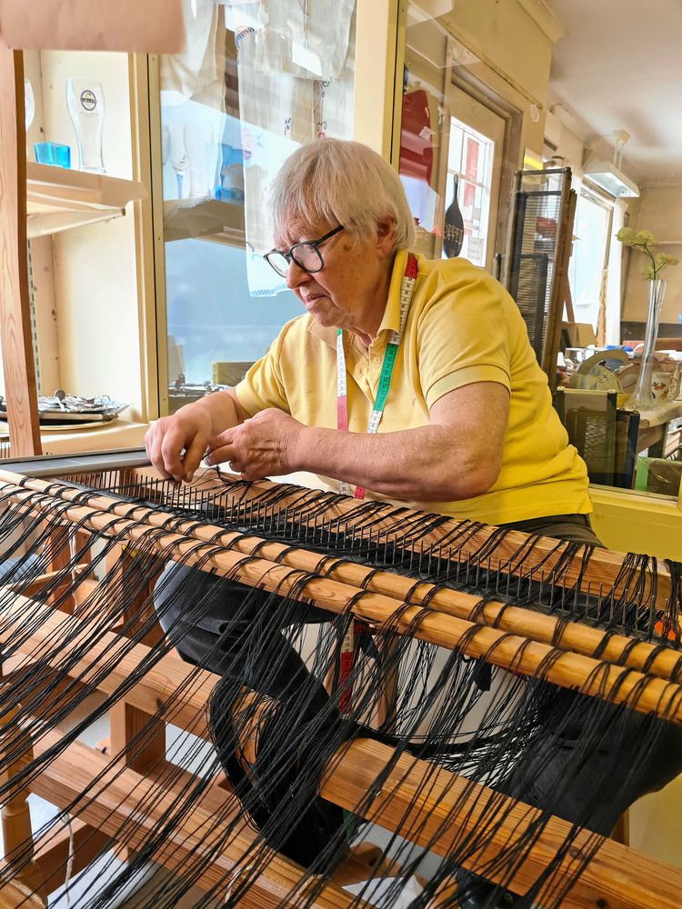 Ingrid kommer ut med flädersaft, givetvis hemgjord, och 40 garnhärvor. Hon instruerar Ann-Charlotte hur de ska knytas – och berättar att även hon har lärt sig flera nya saker under året.