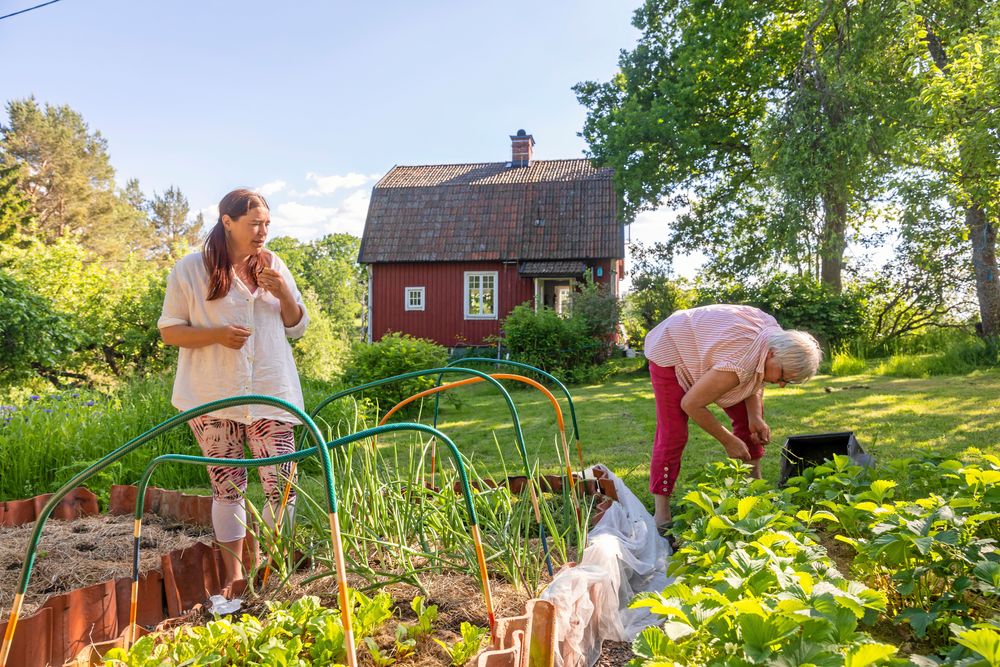 Mamma Ingrid Andersson har just rensat jordgubbslandet och försvinner in i det röda bostadshuset för att hämta garnhärvor som ska knytas inför veckans växtfärgning.
