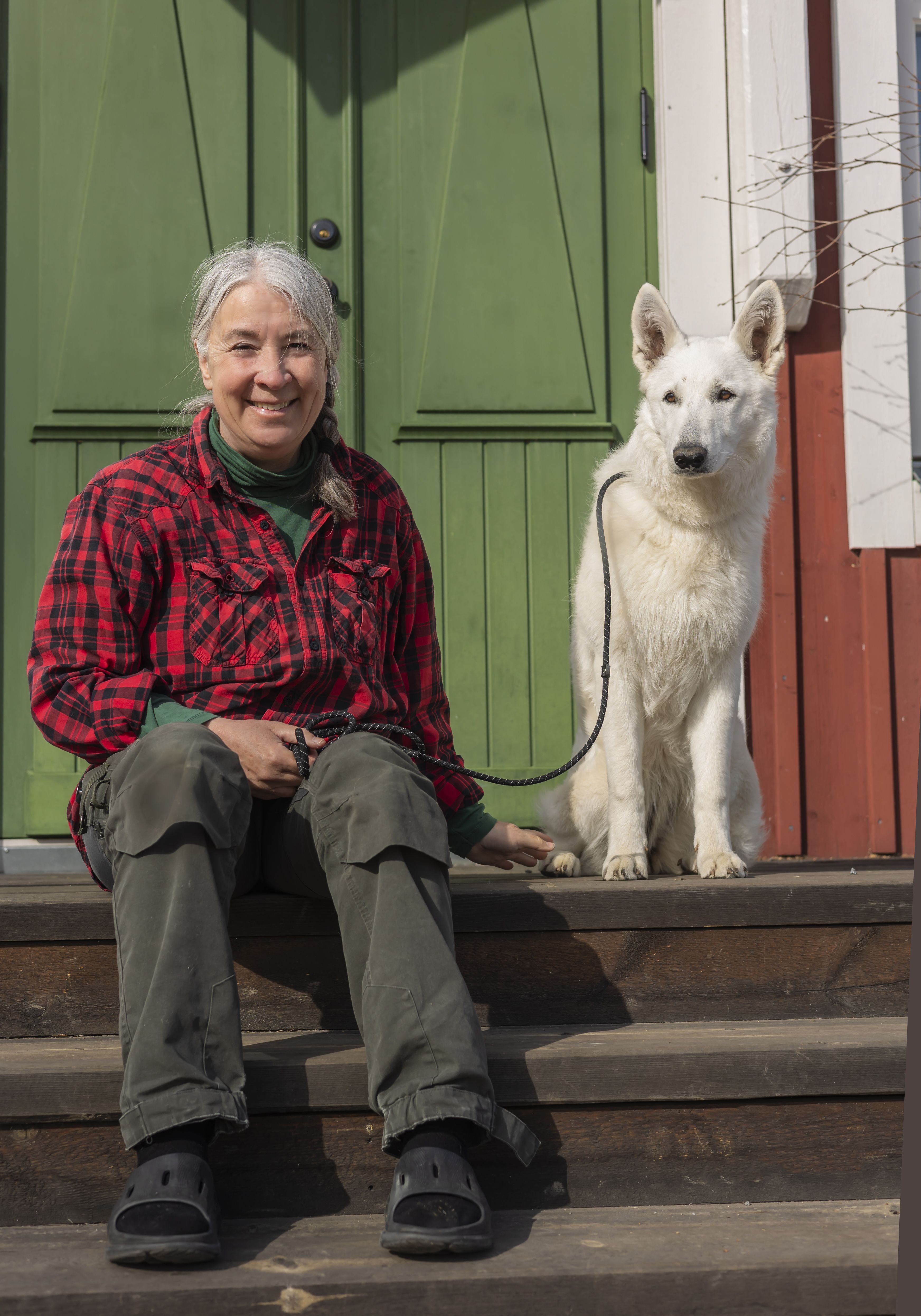 Hunden Ava och Anna-Carin tar emot på gården vid Luleälven. Solen lyser över isen där färjan står parkerad i väntan på att tas i bruk senare i vår. Fortfarande är det isvägen som gäller för att köra över till andra sidan och byn Sunderbyn.