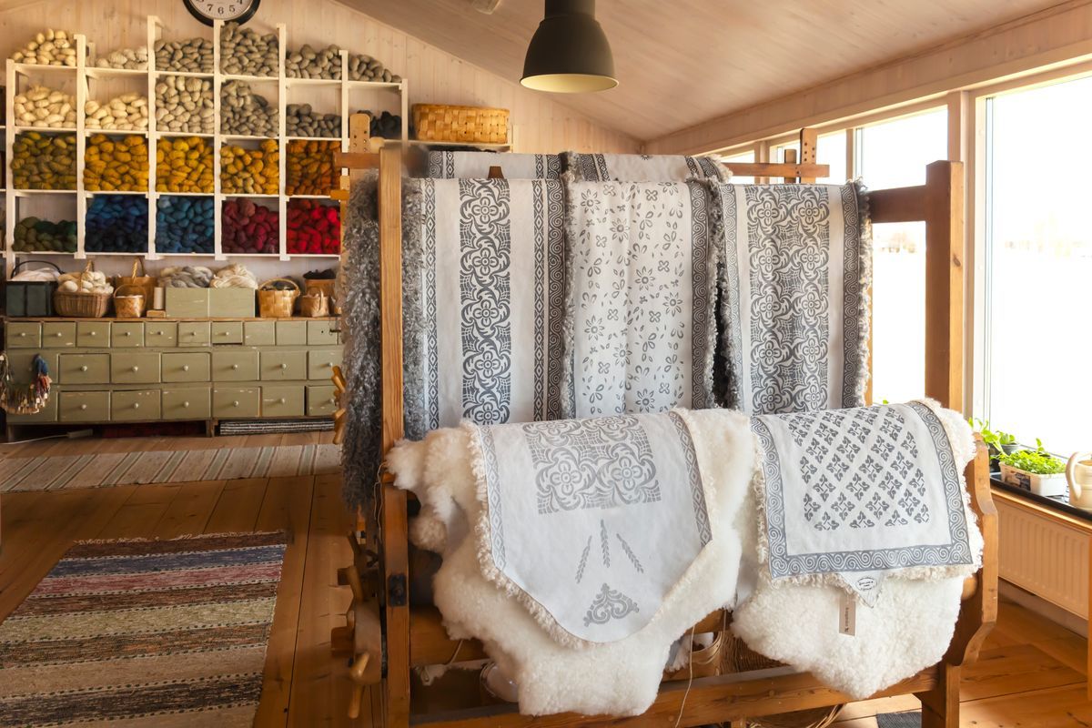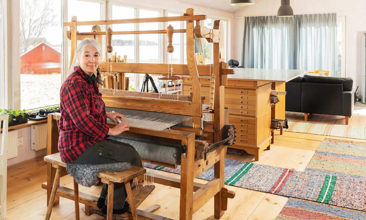 Även de tre vävstolarna har hon ärvt från mamman. På den ena håller hon på med en pläd, på den andra väver hon ihop remsor av fårskinn till en matta och på den tredje blir det klassiska trasmattor.