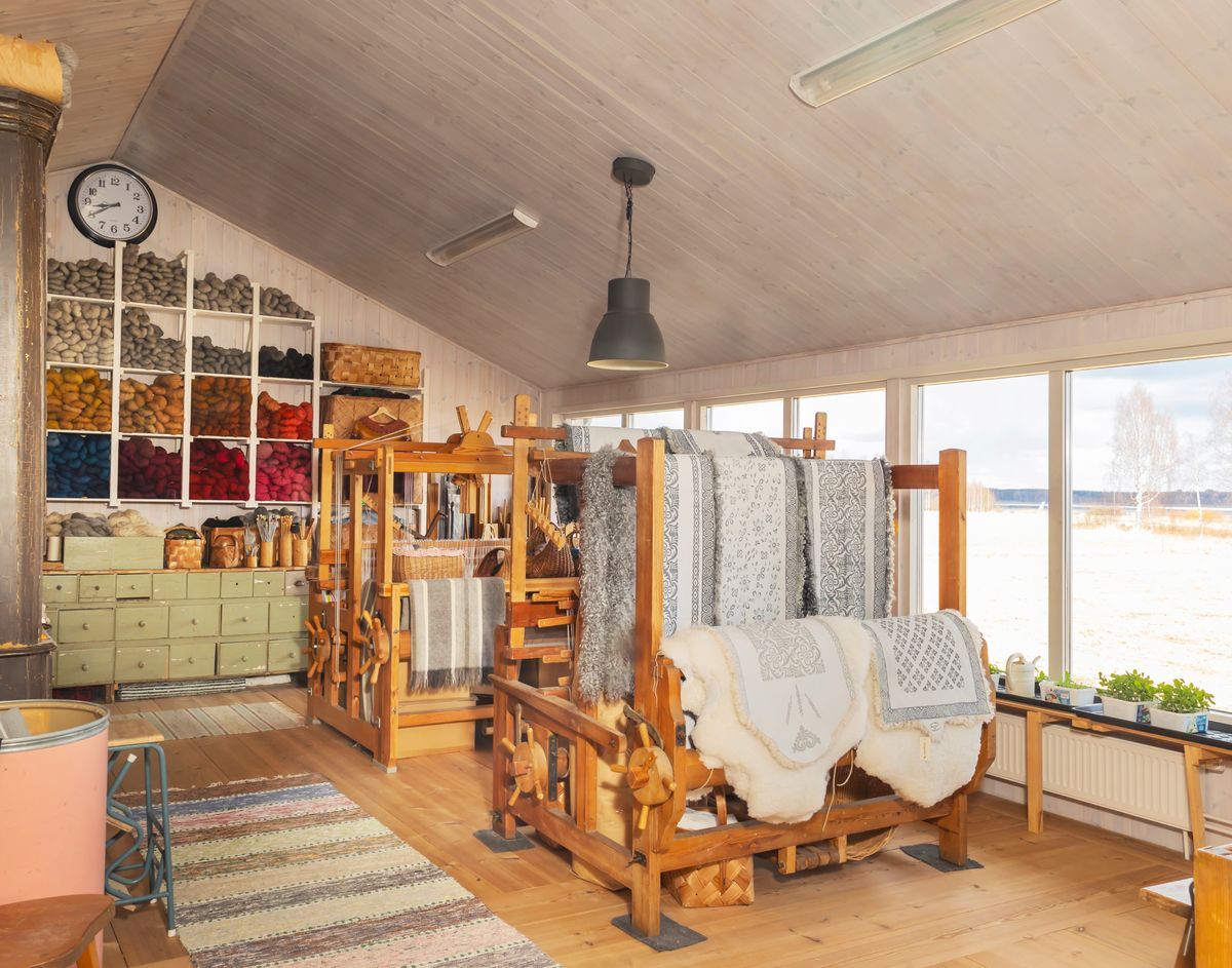 För att ta till vara på utsikten maximalt har ladugården fått stora fönster mot älven. Det har gjort att det är en ljus och inbjudande plats att skapa i. Tre vävstolar står på rad, i ett hörn finns tre olika sorters symaskiner och en hel vägg pryds av växtfärgade garner på väggfasta hyllor.